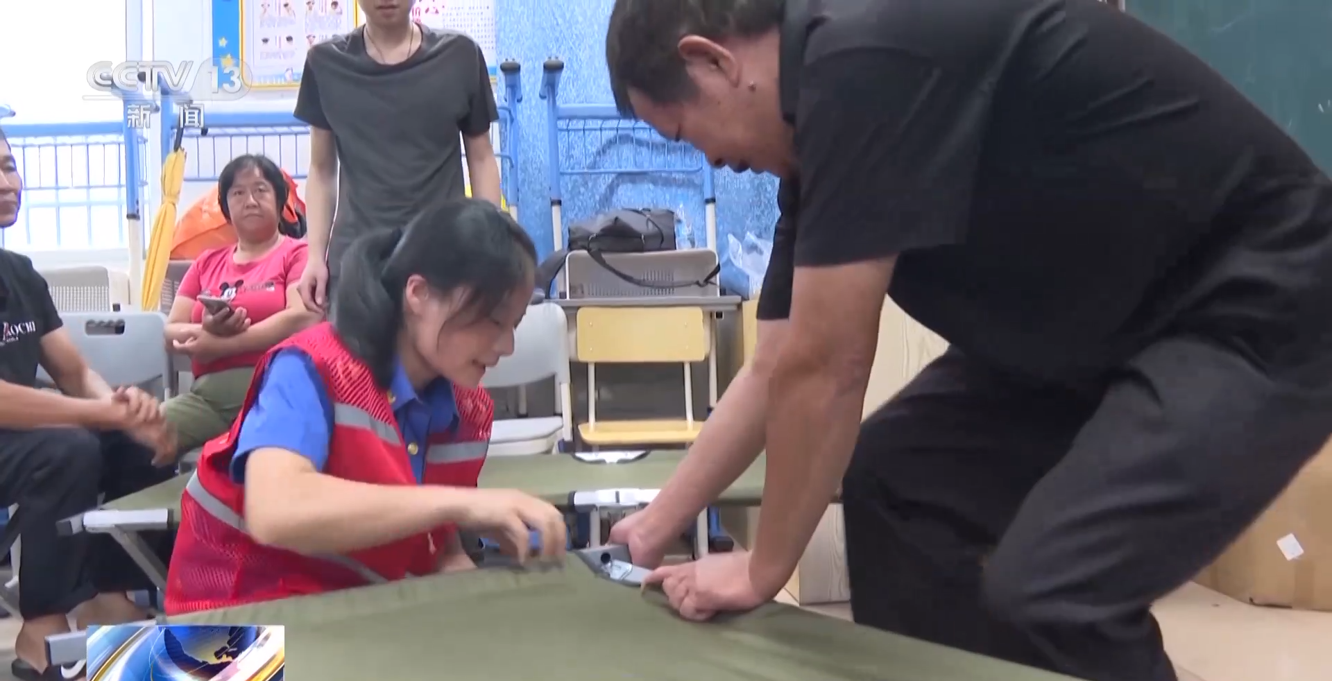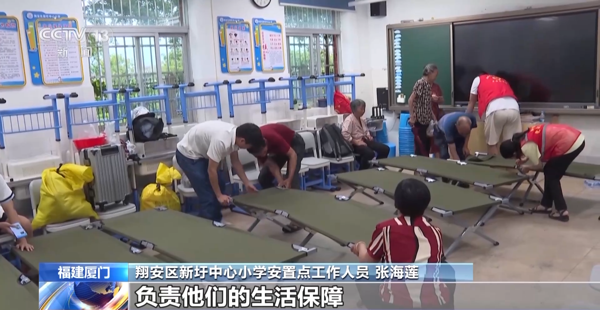 厦门市翔安区新圩中心小学安置点工作人员 张海莲:我们每间教室都安排有两个人负责他们的生活,医生护士也是24小时值夜班,保障临时有突发状况我们随时都可以处理。他们的三餐我们都有保障,还有卫生间厕所洗澡的都有。