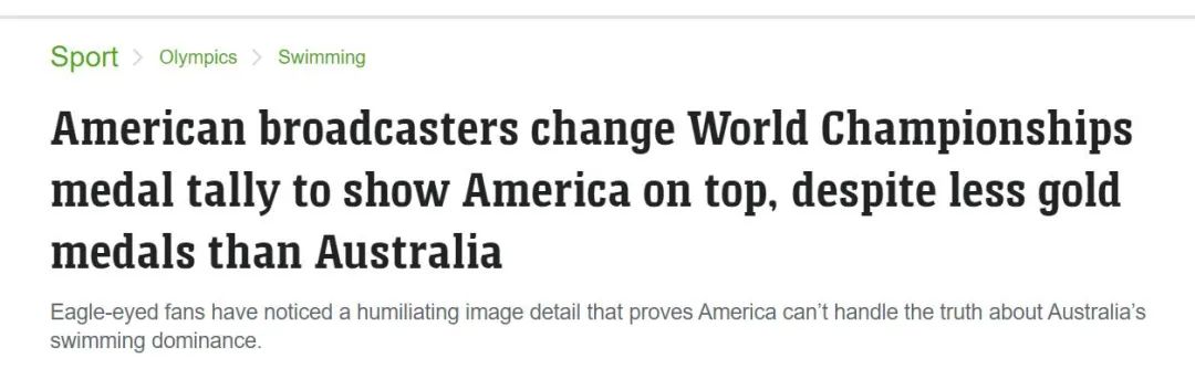 美国媒体的这一操作,把澳大利亚同行也惹急了。澳大利亚新闻网站news.com.au在报道中指出,美国的广播公司改变了世界锦标赛的奖牌榜显示方式,尽管其金牌数量比澳大利亚少,仍将美国排在了榜首。
