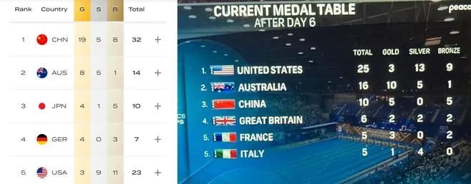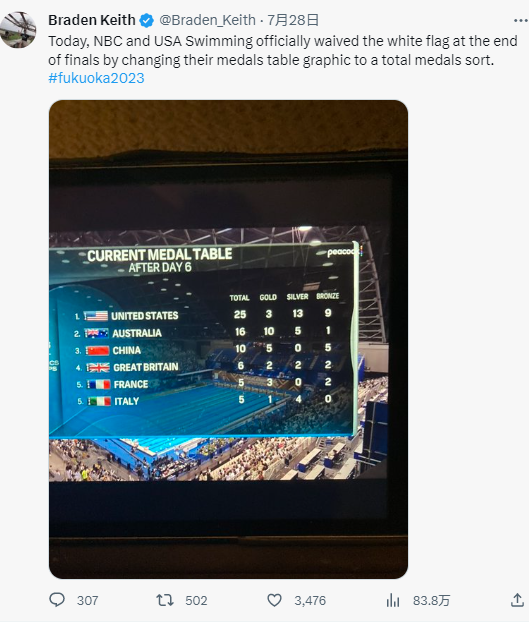 NBC这一操作,把美国媒体自己都惊到了。美国游泳资讯网站SwimSwam在标题里直接惊呼:根据NBC的排名,美国在第六个比赛日后突然领跑奖牌榜了。