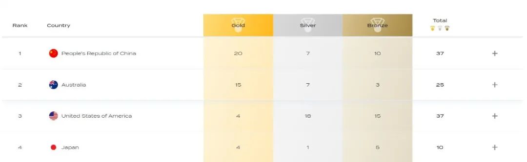 而中国队凭借优异表现,以20块金牌暂居第一,澳大利亚以15枚金牌排名第二。