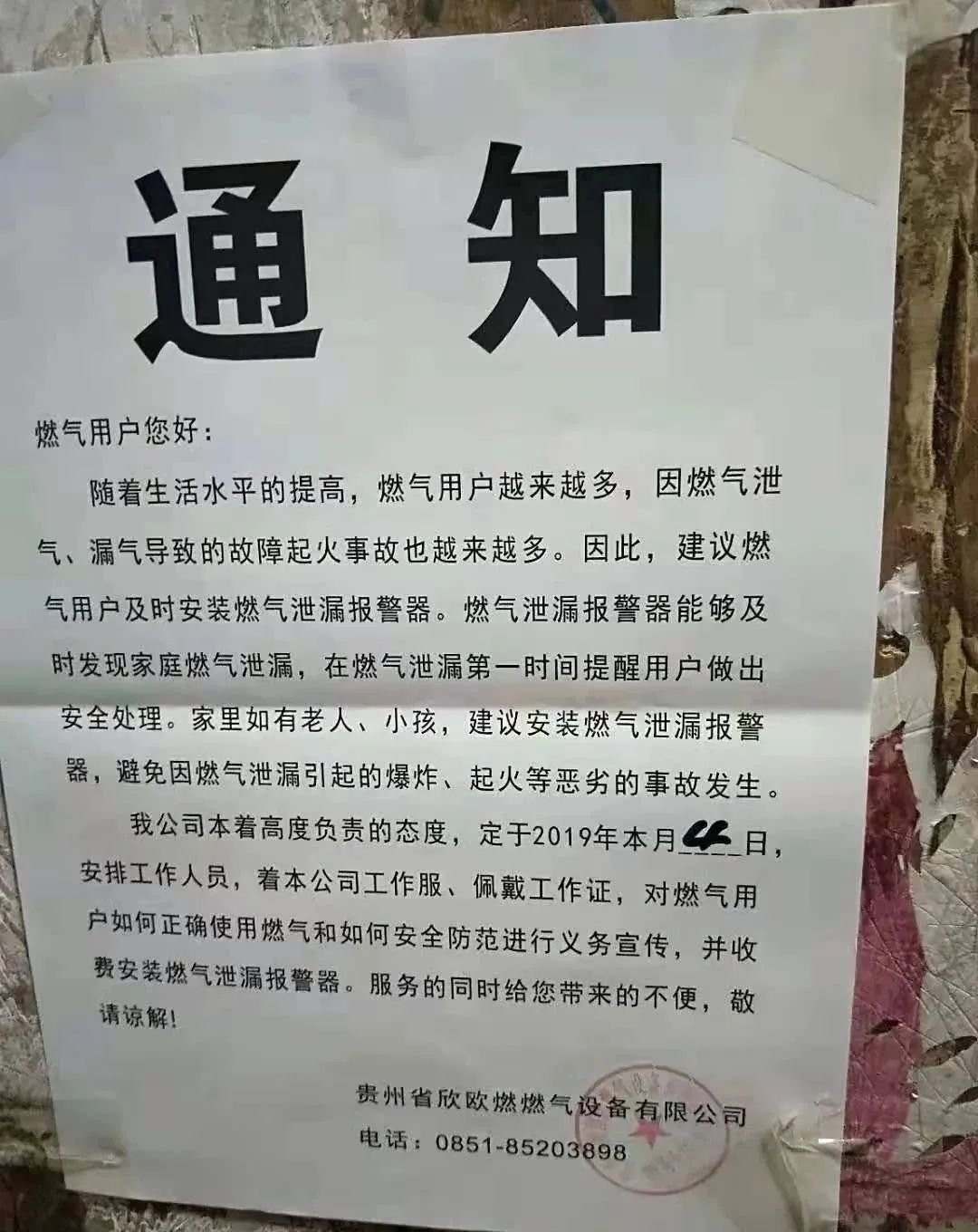 2019年,贵州毕节多个小区业主遭遇类似骗局,有人以“燃气公司安全检查”的名义,上门安装“燃气报警器”,有业主发现,在自家小区楼下贴了“假告示”,让人一时间无法分辨真假,有人因此被骗了几百元。