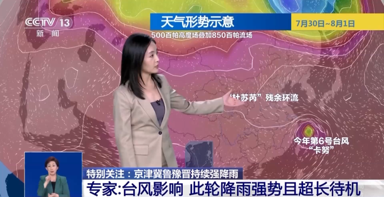 在31日的时候,它的系统减弱,但是第六号台风卡努靠近通道打通,给刚要结束的降雨又补充了水汽,所以整体导致华北这次的雨将会是超长待机,包括北京可能一直要到8月2日才能结束,强降雨时段在周日以及周一两天还是会非常的明显,包括石家庄、天津也都是如此。