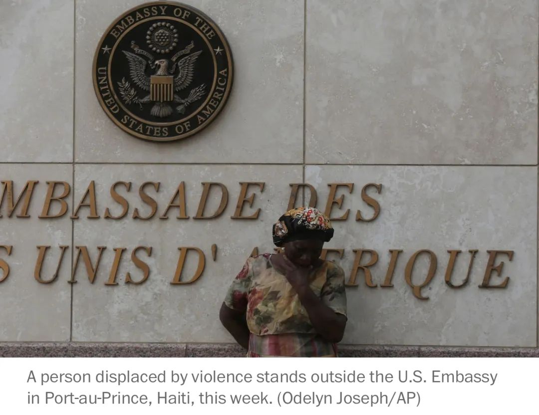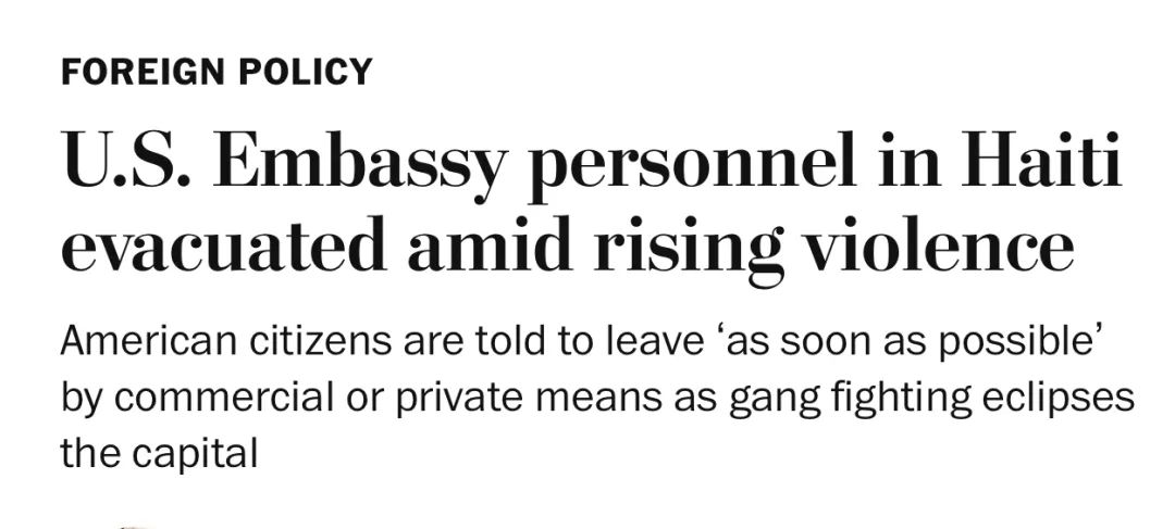 报道称,美国驻海地首都太子港的大使馆,当地时间周四晚间发表声明,“下令撤离”相关人员。此前一个星期,来自周边区域的海地人聚集在大使馆外,寻求保护,躲避由于当地帮派斗争造成的“猛烈炮火”。大使馆工作人员已经被命令“在进一步通知之前”不要离开美国大使馆区域。