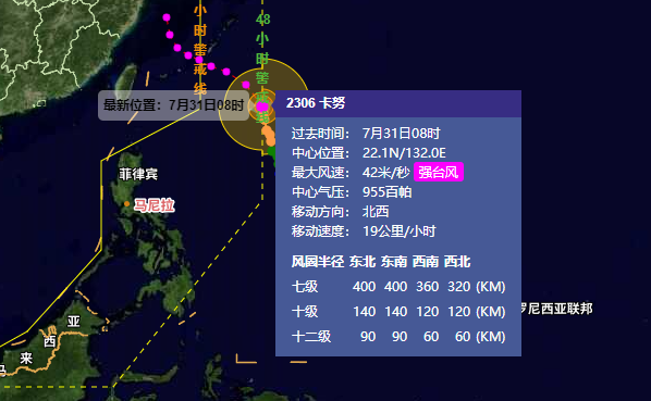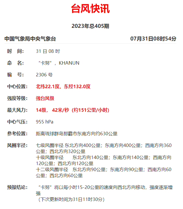 另据中央气象台最新消息,台风“卡努”已于今日8时升级为强台风。最大风力:14级,42米/秒(约151公里/小时)。中心气压:955 hPa。参考位置:距离琉球群岛那霸市东南方向约630公里。“卡努”将以每小时15-20公里的速度向西北方向移动,强度逐渐增。