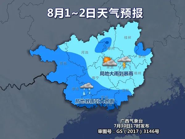 8月1-2日 ,桂南、桂西部分地区有中雨、局地暴雨到大暴雨,我区其它地区多云有阵雨或雷雨、局地大雨到暴雨。