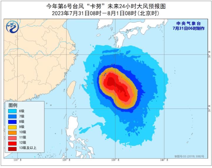 7月31日夜间至8月2日夜间,黄海南部海域、东海大部海域、巴士海峡、台湾以东洋面将有6~7级、阵风8~9级大风,其中东海南部部分海域将有8~11级、阵风12~13级大风,台风“卡努”中心经过的附近海域风力可达12~15级、阵风16级。