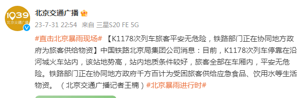 中国铁路北京局集团公司消息:目前,K1178次列车停靠在沿河城火车站内,该站地势高,站内地质条件较好,旅客全部在车厢内,平安无危险。铁路部门正在协同地方政府千方百计为受困旅客供给应急食品、饮用水等生活物资。 (北京交通广播记者王楠)