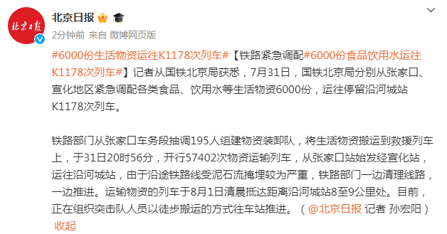 记者从国铁北京局获悉,7月31日,国铁北京局分别从张家口、宣化地区紧急调配各类食品、饮用水等生活物资6000份,运往停留沿河城站K1178次列车。