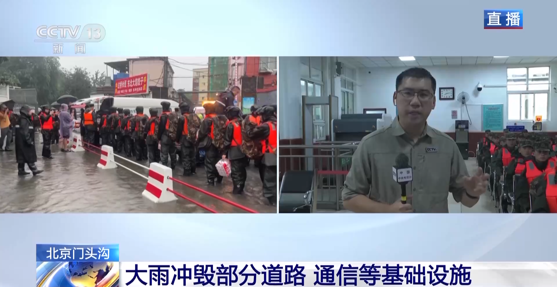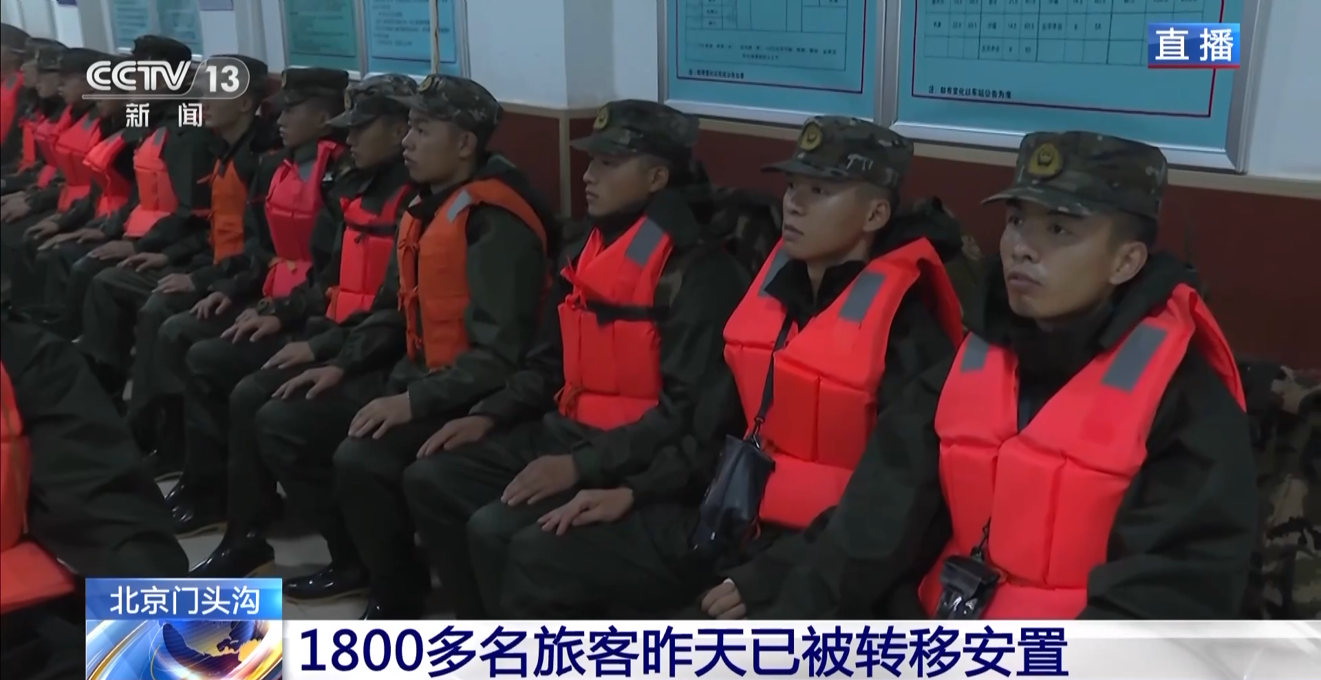总台记者 王丰:在北京市门头沟区的三家店火车站候车大厅,这些官兵来自武警北京总队机动三支队,他们在这里候车,即将执行今天的救援任务。他们今天的任务是前往门头沟区妙峰山镇的水峪嘴村,那里有300多名村民需要基本生活物资,他们此行的目的是把基本生活物资运送上去,除此之外,还要把一些受伤的村民转运出来。