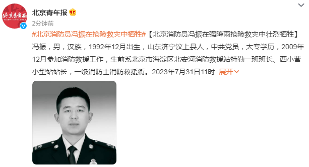 冯振,男,汉族,1992年12月出生,山东济宁汶上县人,中共党员,大专学历,2009年12月参加消防救援工作,生前系北京市海淀区北安河消防救援站特勤一班班长、西小营小型站站长,一级消防士消防救援衔。2023年7月31日11时49分,北京市海淀区消防救援支队指挥中心接报海淀驾校中联汽车交易市场因发生洪水致3人被困警情,立即调派救援力量赶赴现场处置。12时15分,西小营小型站救援车组行驶至北安河北路时,突遇一名被困山洪急流中的群众向车组招手求救,情况十分危急。带队指挥员冯振命令立即停车组织施救,就地利用消防车建立绳索安全保护,着好救生衣,带领队员冒着洪水激流向被困群众靠近。救援过程中,由于洪水突然暴涨,一名队员被急流冲倒,冯振不顾个人安危,竭尽全力将战友推至安全区域。被困群众及队员安全脱险,冯振因连续作战体力耗尽被洪水冲走。同车人员会同当地干部群众迅疾开展搜救,于12时47分在下游约1公里处搜到冯振,立即采取心肺复苏进行急救,并第一时间送至医院救治,同时协调卫健部门及医学专家参与抢救。经过5个多小时全力救治,18时22分,冯振同志因抢救无效,不幸壮烈牺牲。冯振同志自参加工作以来扎根基层、苦练本领,忠诚履职、无私奉献,在人民群众生命财产安全受到威胁的危急关头,不畏艰险、不怕牺牲,始终战斗在灭火救援第一线,累计参加灭火救援行动3500余次,营救遇险群众150余人,先后荣立个人三等功2次,嘉奖4次,多次获评“岗位练兵先进个人”。