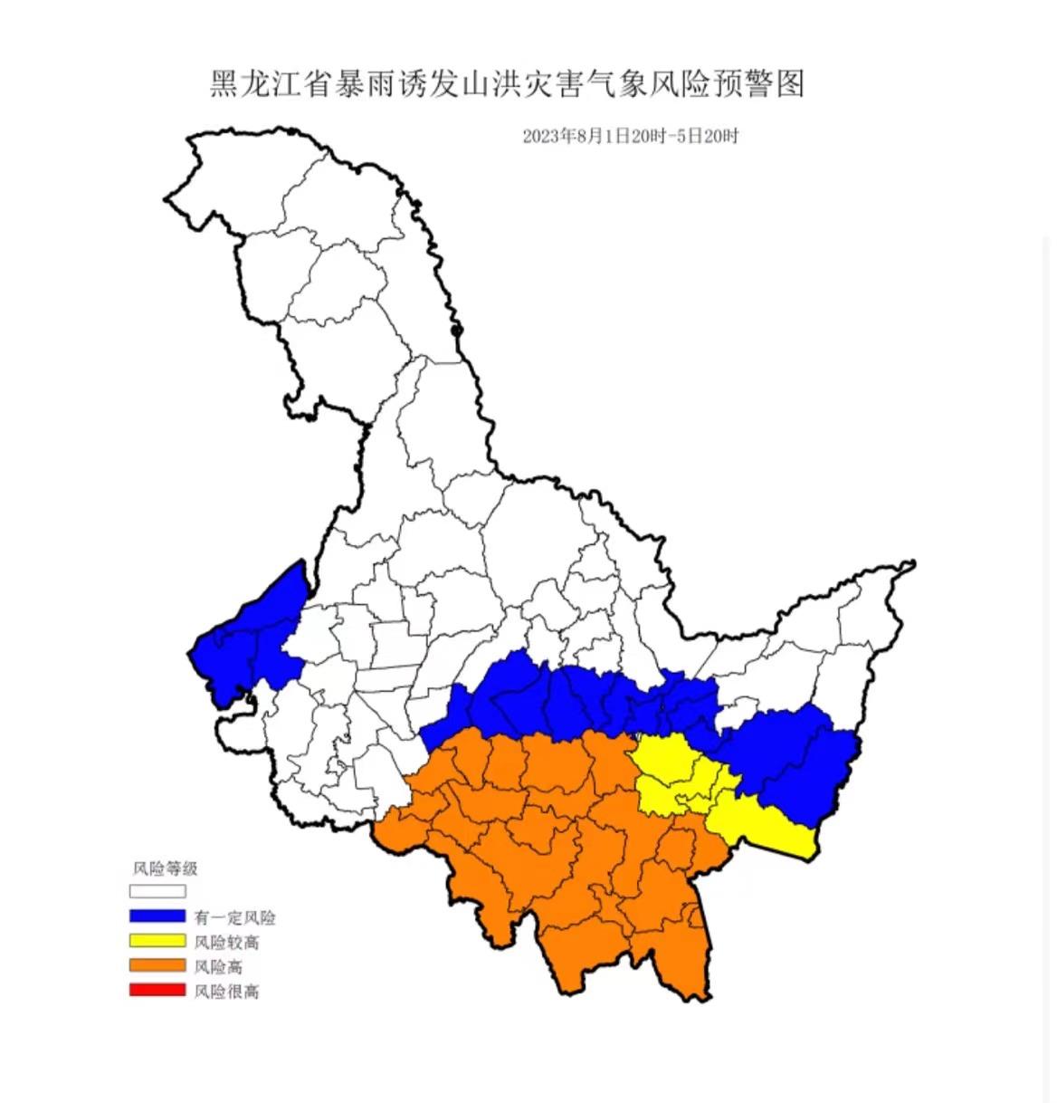 黑龙江省防汛抗旱指挥部办公室、黑龙江省水利厅、黑龙江省气象局8月1日17时联合发布橙色、黄色和蓝色山洪灾害气象风险预警: