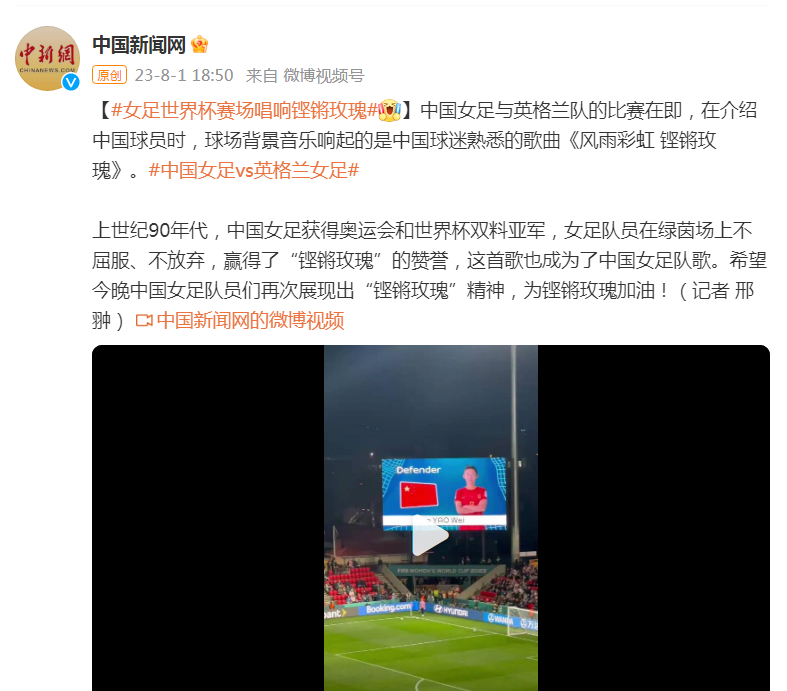 中国女足与英格兰队的比赛在即,在介绍中国球员时,球场背景音乐响起的是中国球迷熟悉的歌曲《风雨彩虹 铿锵玫瑰》。