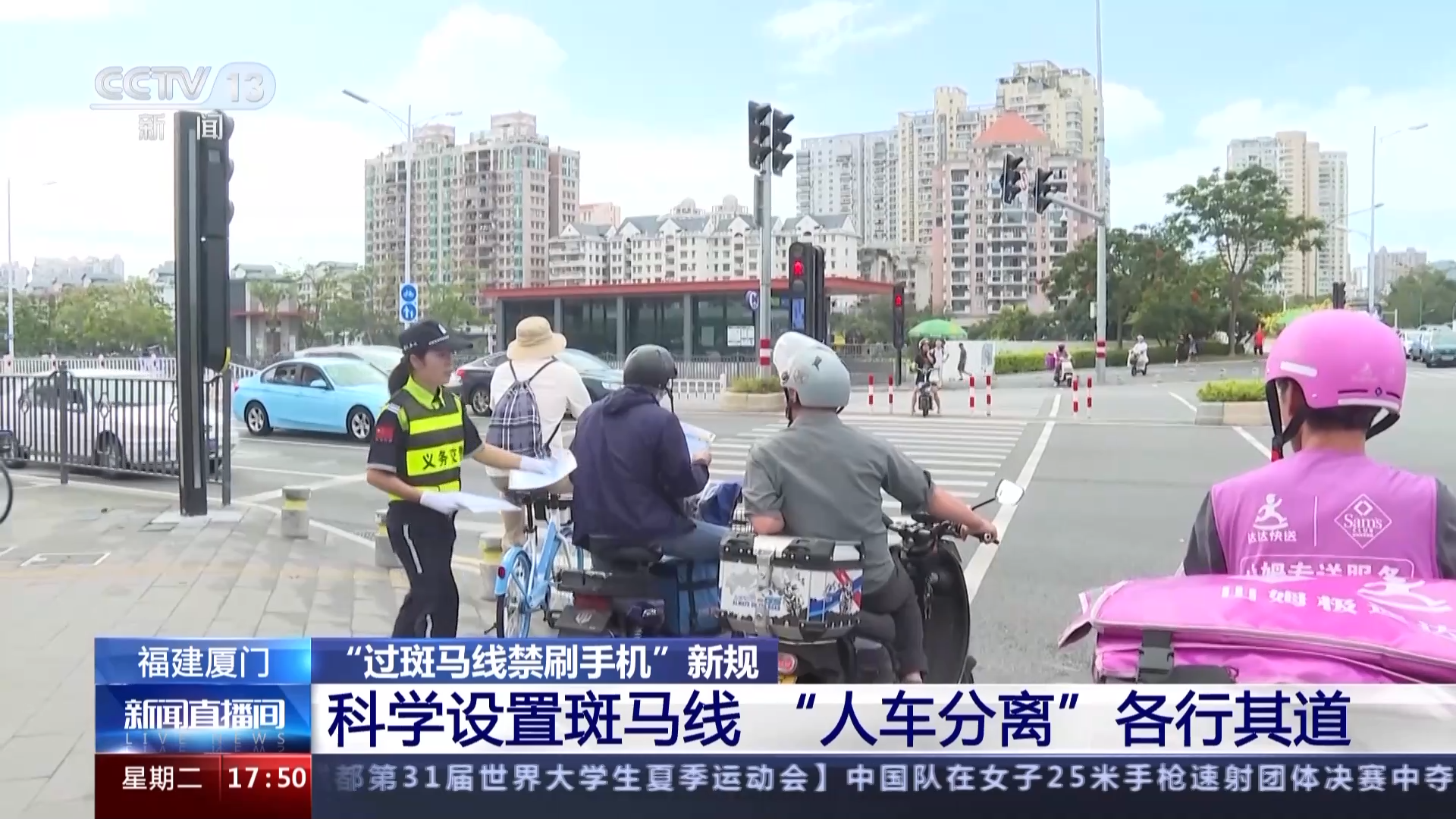 今天起,在福建厦门,行人边过斑马线边浏览手机等电子设备、妨碍到车辆合法通行,将会面临罚款。
