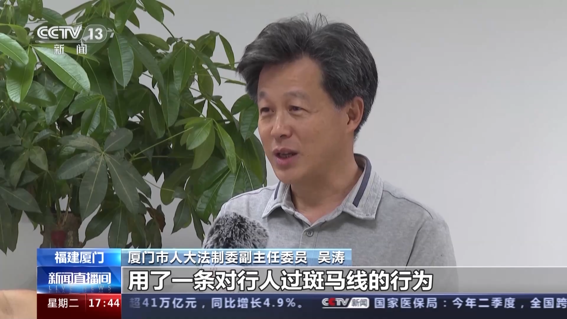 厦门市人大法制委副主任委员 吴涛:这次我们把有限的法规条款,用了一条对行人过斑马线的行为做了具体的描述,其实就是想通过对不文明行为的法治化改造,进一步营造机动车驾驶方跟行人方双方互动理解、共同推动文明进步的一种良好的社会氛围,也是培养一种道路交通通行的文明跟依法的行为模式。
