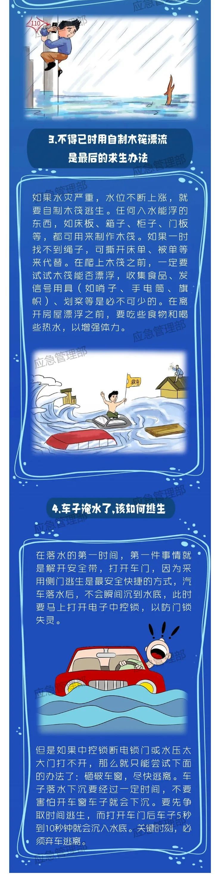 如果水位不断上涨,暂避地方难以自保,可自制木筏逃生,并且收集可用食品、划桨、求救信号工具等等。