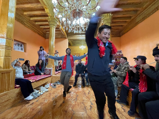 龙吉克的兴致很高,在自家的“蓝盖力”(塔吉克族传统土木结构房屋——编者注)里为大家献上一段塔吉克族传统鹰舞,在场师生都被热烈的气氛感染,纷纷下场加入。