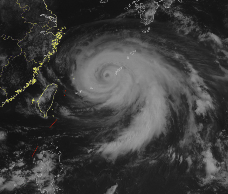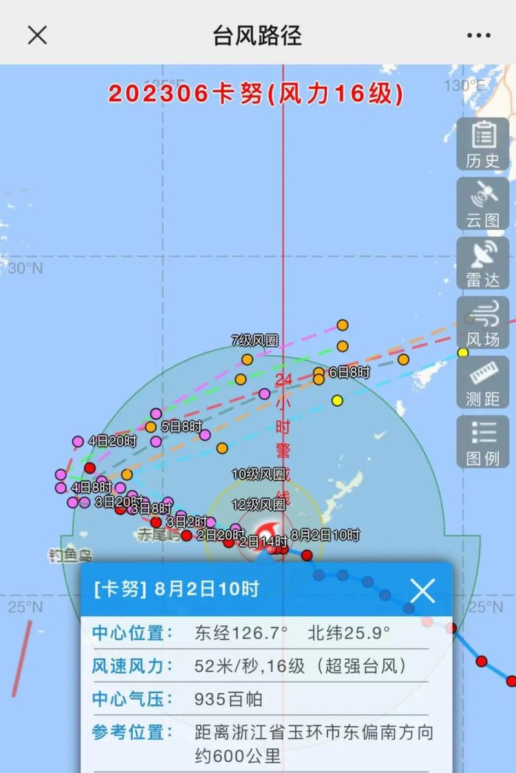 今年第6号台风“卡努”(KHANUN) (超强台风级)的中心今天(2日)上午8点钟位于浙江省玉环市东偏南方向约610公里的东海海面上 ,就是北纬25.7度、东经126.8度,中心附近最大风力有16级52米/秒),中心最低气压为935百帕,七级风圈半径300-360公里,十级风圈半径100公里,十二级风圈半径50公里。