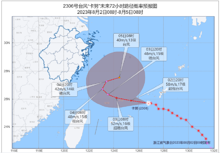预计“卡努”将以每小时10-15公里的速度向西偏北方向移动,强度还将有所增强。 即将移入东海东南部海域,尔后缓慢向西偏北方向移动,最大可能于3日夜里至4日上午在浙江南部近海转向东北方向移动,但仍不排除紧擦我省沿海北上或登陆我省的可能性。