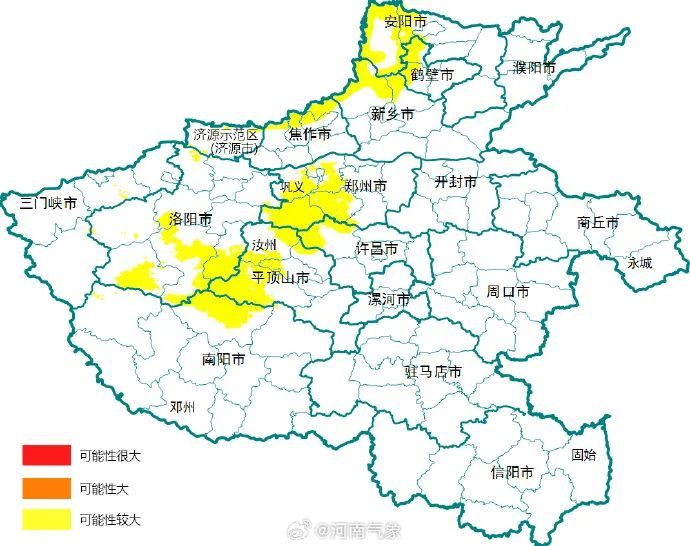 郑州二七区、上街区、荥阳市、新密市、新郑市、登封市、巩义市,洛阳孟津区、偃师区、新安县、宜阳县、洛宁县、伊川县、汝阳县、嵩县、栾川县,平顶山郏县、宝丰县、鲁山县、叶县、汝州市,安阳龙安区、殷都区、林州市,鹤壁鹤山区、山城区、淇滨区、淇县,新乡凤泉区、辉县市、卫辉市,焦作市区、修武县、博爱县、沁阳市,许昌禹州市,三门峡陕州区、卢氏县,南阳西峡县、南召县、方城县,发生地质灾害的可能性较大。