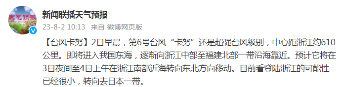 据@新闻联播天气预报,目前看登陆浙江的可能性已经很小,转向去日本一带。
