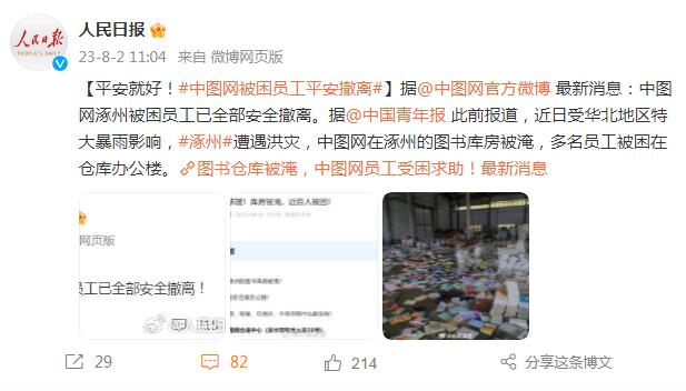据@中图网官方微博 最新消息:中图网涿州被困员工已全部安全撤离。据@中国青年报 此前报道,近日受华北地区特大暴雨影响,涿州遭遇洪灾,中图网在涿州的图书库房被淹,多名员工被困在仓库办公楼。