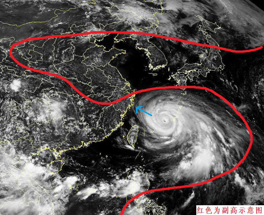 我们知道副热带高压和台风是一对欢喜冤家,作为台风移动的主要引导因素,副高的位置和形态很大程度上主导着台风的走向。当台风处于强盛的副高南侧时,便会像个乖孩子般温顺的沿着副高边缘引导气流稳定的向西或者西北方向行进(见下示意图),同时副高也会给听话的台风不断地输送水汽和能量抚育它做大做强。