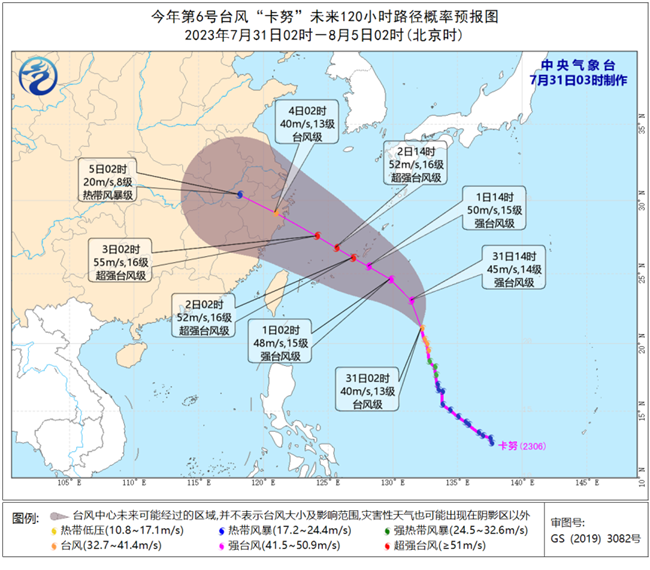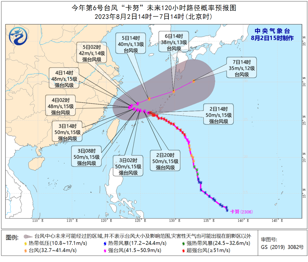 今天下午14时,第6号台风“卡努”(强台风级)中心位于距离浙江省玉环市东偏南方向约540公里的洋面上,预计其将以每小时10-15公里的速度向西偏北方向移动,强度变化不大,并向浙江中部至福建北部一带沿海靠近,3日夜间至4日上午,在浙江南部近海转向东北方向移动,趋向日本南部洋面,强度逐渐减弱。