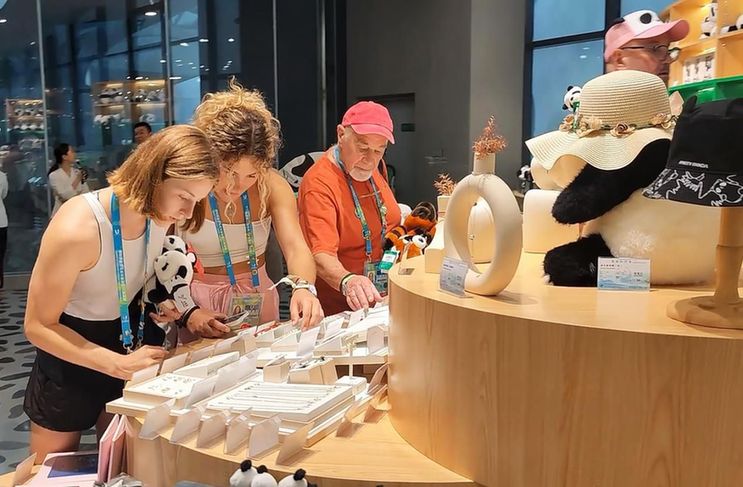 在成都大熊猫繁育研究基地一楼的大熊猫纪念品商店里同样排起了采购大熊猫纪念品的长龙。或抱或拎,品类多样、设计精巧的熊猫物件挤满了运动员的双手。