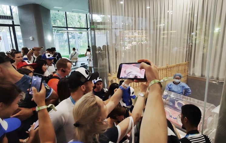 前来参观的运动员们纷纷举起手机与大熊猫合影,记录下美好一幕。来自匈牙利的运动员凡妮在本届大运会上摘得艺术体操项目两枚金牌,首次看到大熊猫的她直言“终于来到这里圆了大熊猫梦!”