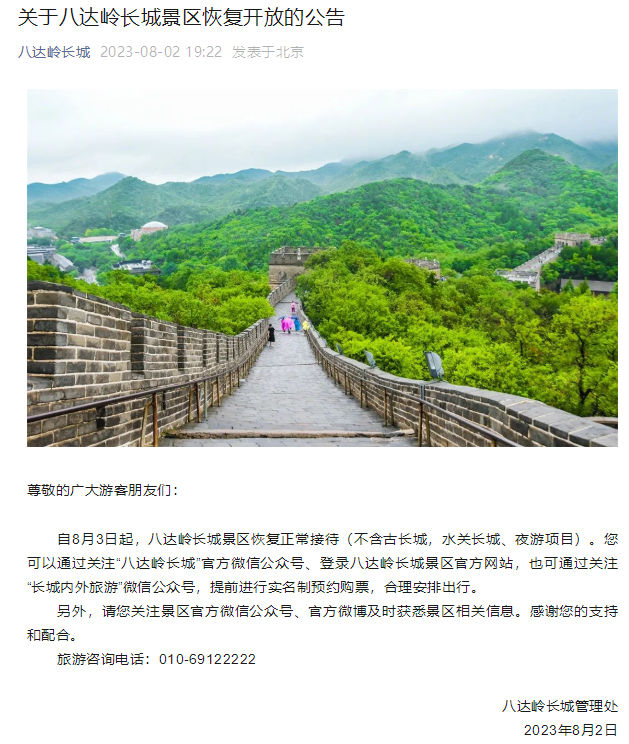 关于八达岭长城景区恢复开放的公告