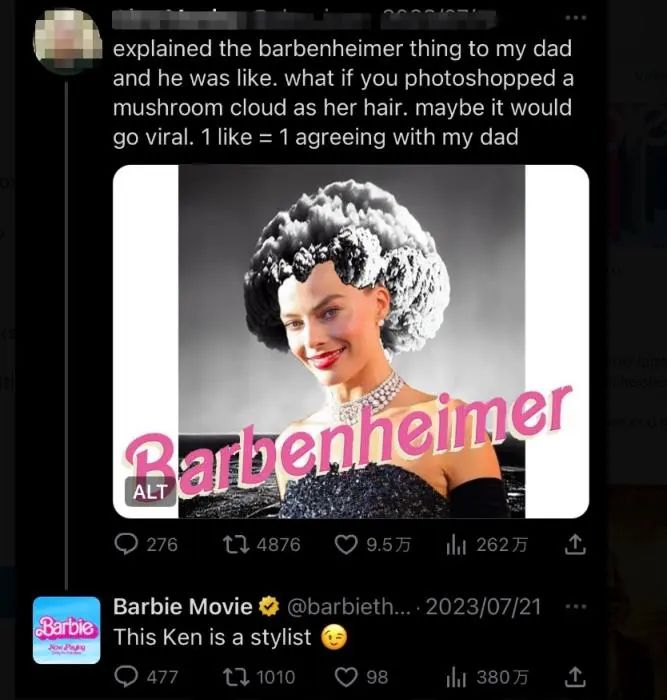 在另一则网友的玩梗推文中,演员罗比的头发被P成原子弹爆炸时产生的“蘑菇云”造型, 《芭比》电影的官方账号则在推文下留言,“这个肯尼是一名造型师(“肯”在芭比世界中代指男性)”,文末还附上调皮眨眼的表情符号。