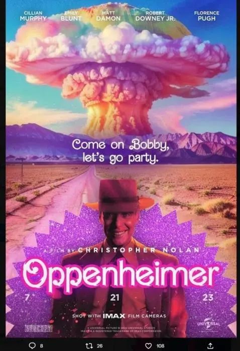 许多影迷将两部影片中主人公的名字“芭比”、“奥本海默”组合起来创造了一个新词——“芭本海默”(Barbenheimer)。 此外,他们还在社交媒体上制作各种与#芭本海默#相关的恶搞梗图。
