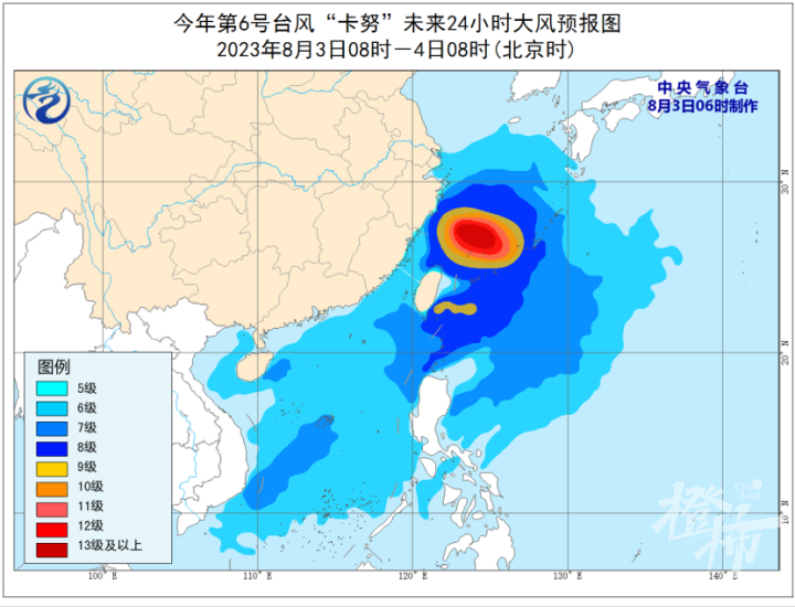 大风预报:8月3日08时至4日08时,南海大部、北部湾、台湾海峡、巴士海峡、台湾以东洋面、东海及钓鱼岛附近海域以及长江口区、杭州湾、浙江沿海、福建沿海、台湾岛沿海将有6-8级、阵风9-10级的大风,其中台湾以东洋面部分海域、东海南部及钓鱼岛附近海域风力可达9-12级、阵风13-14级,“卡努”中心经过的附近海域风力有13-15级、阵风16-17级。