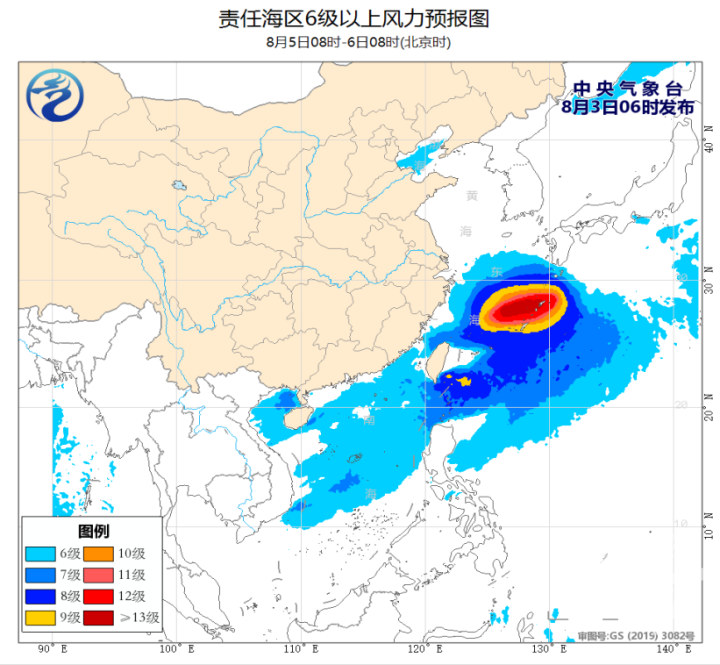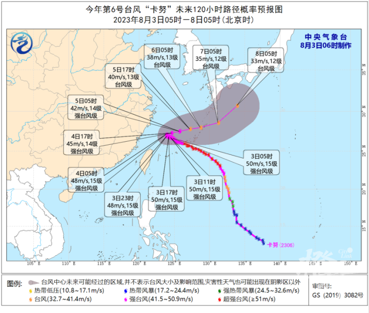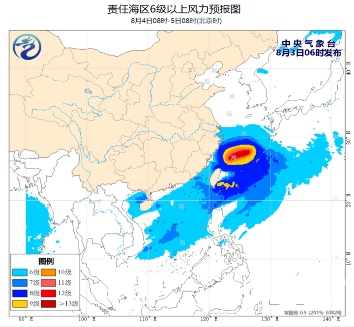 8月3日白天至5日夜间,东海大部海域、巴士海峡、台湾海峡、台湾以东洋面、南海大部海域将有6~8级、阵风9~10级大风,其中东海南部、台湾以东洋面的部分海域将有9~12级、阵风13~14级大风,台风“卡努”中心经过的附近海域风力可达13~15级、阵风16~17级。为此,中央气象台8月3日06时继续发布《大风黄色预警》。