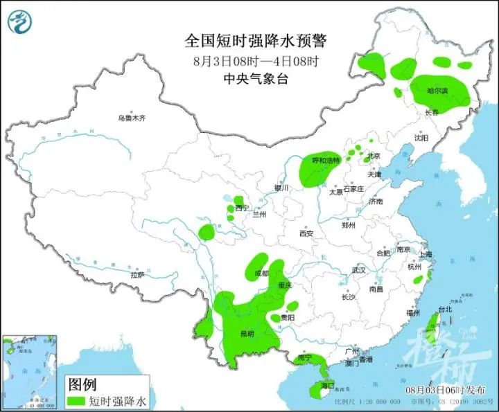 预计8月3日08时至4日08时,内蒙古河套地区和东北部、黑龙江南部、吉林中西部、青海东部、陕西北部、山西北部、河北北部、浙江东部、台湾岛北部等地的部分地区将有8-10级雷暴大风或冰雹天气,局地风力可达11-12级,并可能出现龙卷;内蒙古河套地区和东北部、黑龙江中南部、吉林中西部和东北部、青海东部、陕西北部、山西北部、河北北部、北京东部、四川盆地西部和中南部、重庆西部、贵州中西部、云南、广西东南部、广东西南部沿海、海南岛西部和北部、台湾岛等地的部分地区将有短时强降水天气,小时雨量40-70毫米,局地可达80毫米以上。