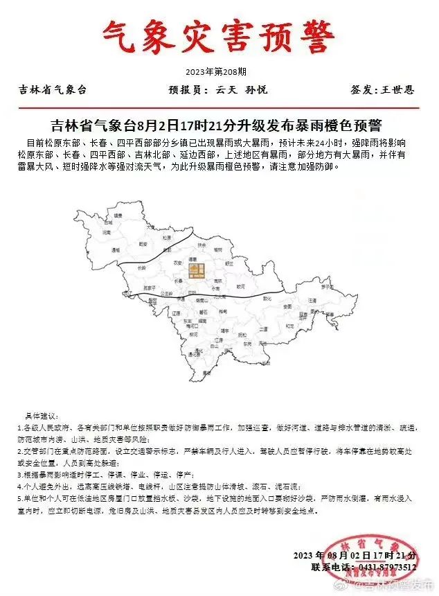 吉林省气象台8月2日17时21分升级发布暴雨橙色预警:松原东部、长春、四平西部部分乡镇已出现暴雨或大暴雨,预计未来24小时,强降雨将影响松原东部、长春、四平西部、吉林北部、延边西部, 上述地区有暴雨,部分地方有大暴雨,并伴有雷暴大风、短时强降水等强对流天气,为此升级暴雨橙色预警。