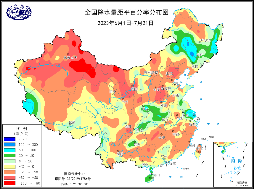 今年6月1日至7月21日,全国平均气温为1961年以来历史同期第2高,降水量为第6少;7月22日以来(7月22日至8月1日),随着华北雨季到来,我国气候总体形势由前期的暖干快速转为暖湿。