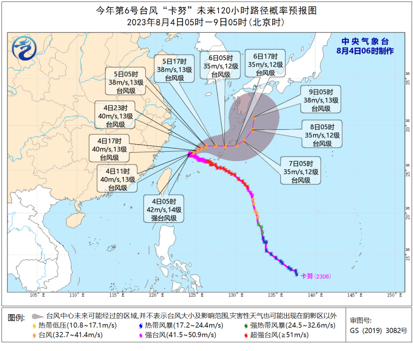 据中央气象台消息,今年第6号台风“卡努”(强台风级)的中心今天早晨5点钟仍位于浙江省玉环市东偏南方大约330公里的东海南部海面上,就是北纬26.8度、东经124.2度,中心附近最大风力有14级(42米/秒),中心最低气压为955百帕,七级风圈半径360公里,十级风圈半径170-190公里,十二级风圈半径100公里。