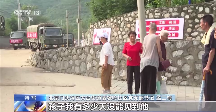 北京门头沟区大台街道落坡岭社区党支部书记 孟二梅:到现在我没有联系到我哥,房山受灾也很严重,到现在我没有联系到他们,他们也没有给我任何消息,孩子我有多少天没能见到他,不知道是不是今天跟他们一块走了。就是自己顾自己吧。我儿子在这,我老公也在这,我老公一直跟我一样,一晚上都没有睡,都在一块跟我们奋战。我是共产党员,我一定要保证我们所有群众的安全。做一个踏踏实实真正为人民服务的公仆,虽然我完成的肯定不是特别出色,但是我尽我最大的努力。