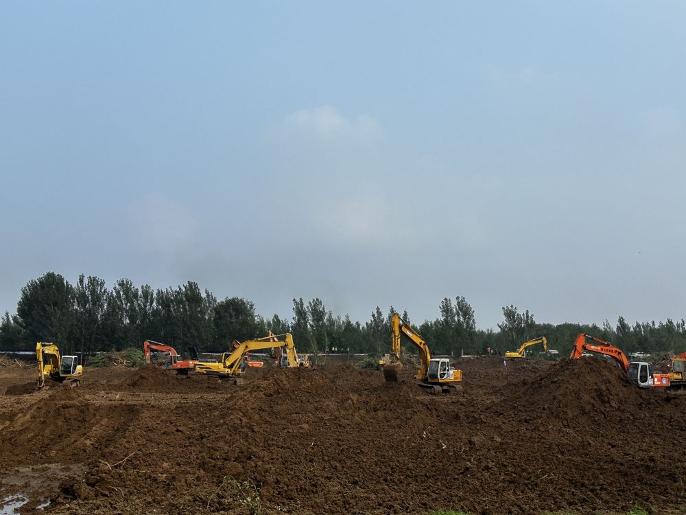 机器的轰鸣声此起彼伏,渣土运输车来回穿梭,170多台挖掘机、推土机同时作业。位于天津市静海区台头镇子牙河两岸的东淀蓄滞洪区缺口封堵现场,一派热火朝天。