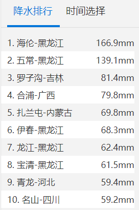 截至8月5日8时,黑河、伊春、齐齐哈尔、大庆、绥化、哈尔滨、鹤岗、佳木斯、鸡西、牡丹江等地有157个站点降雨量超过100毫米,五常、龙江、宁安等6个站点的降雨量超过250毫米,最大为五常市龙凤山281.9毫米。