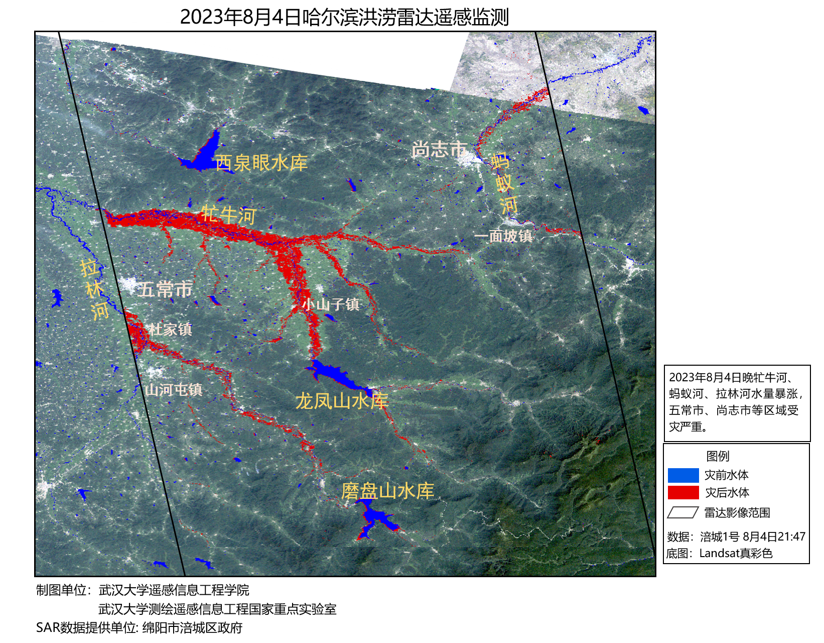 影像中黑色框线内区域为监测范围。红色区域为洪涝已淹没区域,蓝色区域为灾前水体,从图中可以看出黑龙江牤牛河、蚂蚁河、拉林河水量暴涨,河道宽度相对灾前(蓝色)大大拓宽。五常市、尚志市等区域受灾严重。