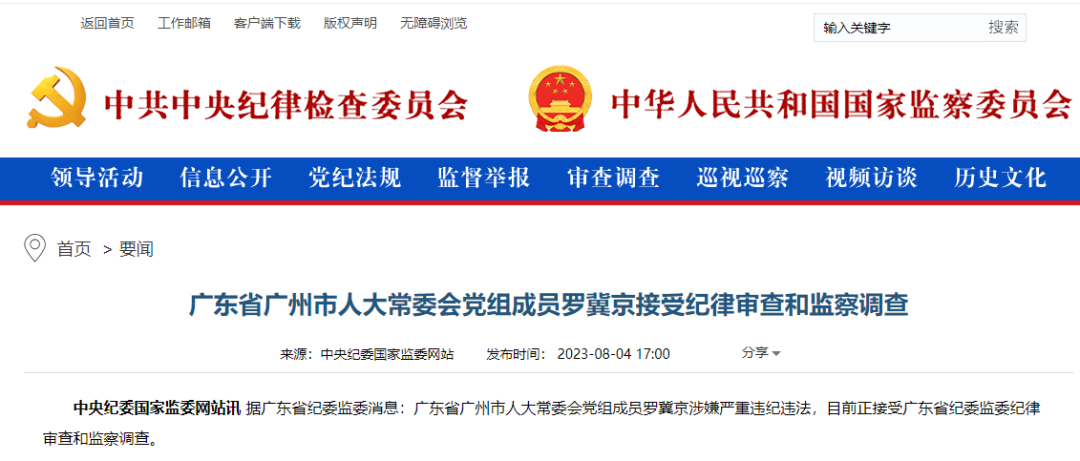据广东省纪委监委消息:广东省广州市人大常委会党组成员罗冀京涉嫌严重违纪违法,目前正接受广东省纪委监委纪律审查和监察调查。