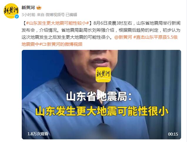 8月6日凌晨3时左右,山东省地震局举行新闻发布会,介绍情况。省地震局副局长刘希强介绍,根据震后趋势的判定,初步认为这次地震发生之后发生更大地震的可能性很小。