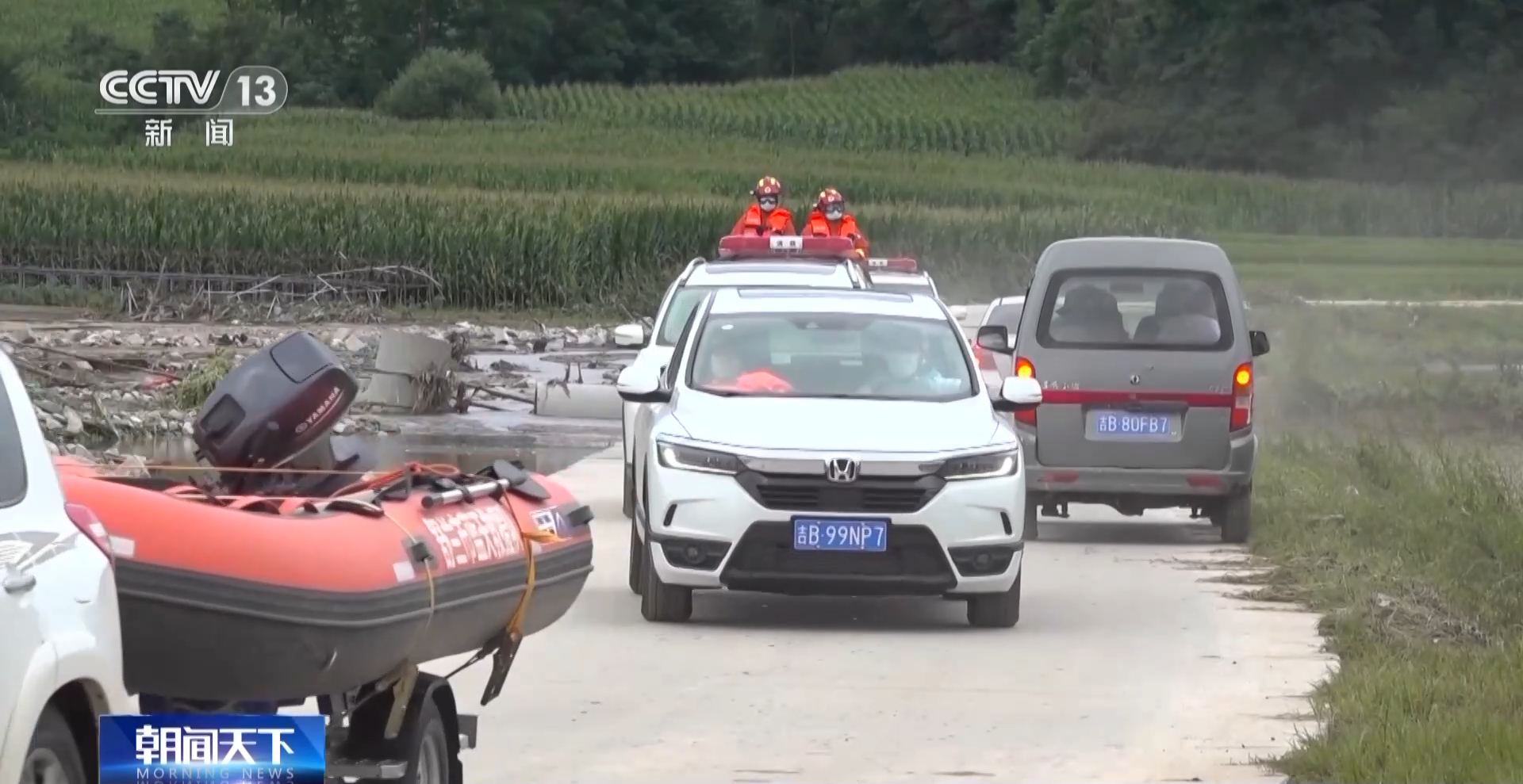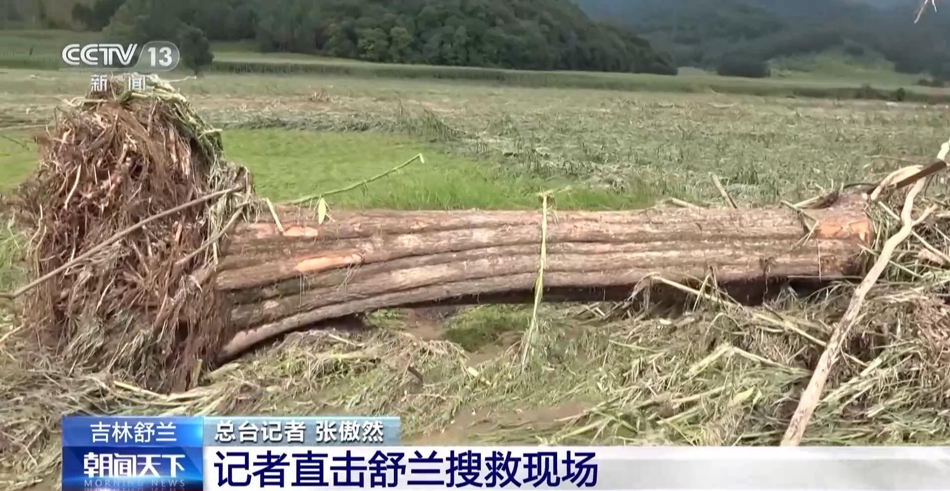 总台记者 张傲然:旁边的这棵树由于降雨和大风,已经被连根拔起了。前方所有的玉米已经是倒伏的状态。我们目前正跟随当地的救援队伍向前推进,来确定被困人员的位置。