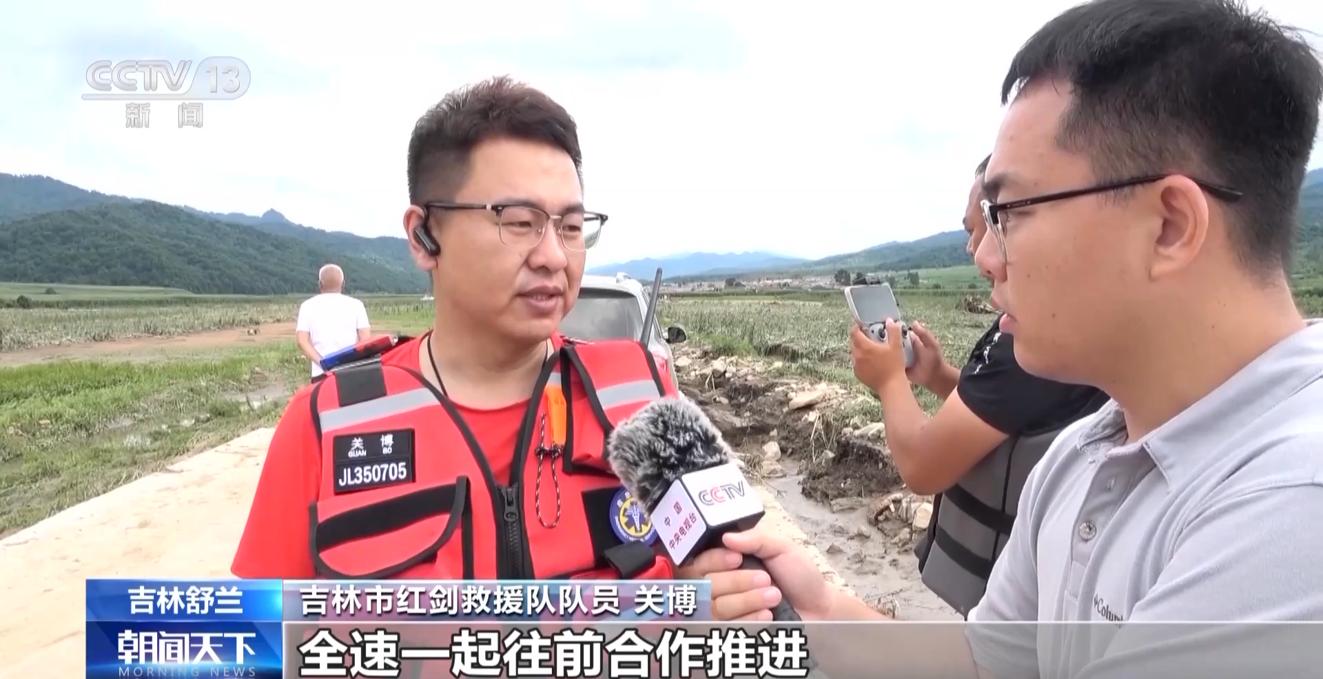 吉林市红剑救援队队员 关博:跟各个相关部门,消防救援部门,民兵部门,还有镇政府部门,全速一起往前合作推进。