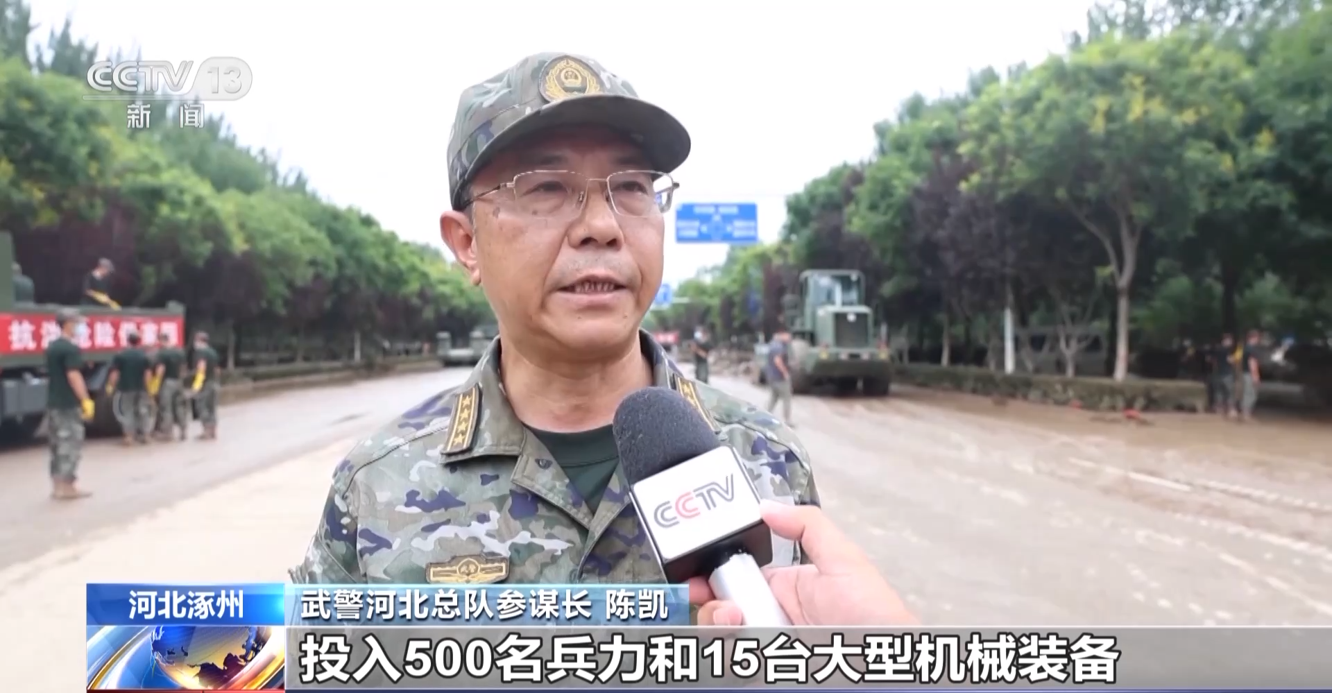 武警河北总队参谋长 陈凯:武警河北总队投入500名兵力和15台大型机械装备,按照洪水退到哪儿清淤工作就跟进到哪儿的原则,帮助周边的企业、商户和居民尽快恢复生产生活秩序。