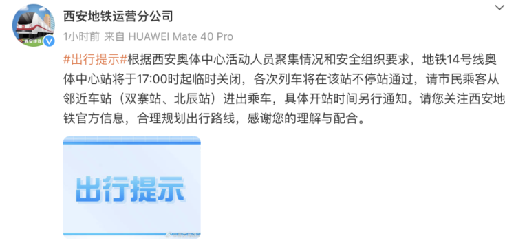 根据西安奥体中心活动人员聚集情况和安全组织要求,地铁14号线奥体中心站将于17:00时起临时关闭,各次列车将在该站不停站通过,请市民乘客从邻近车站(双寨站、北辰站)进出乘车,具体开站时间另行通知 。请您关注西安地铁官方信息,合理规划出行路线,感谢您的理解与配合。