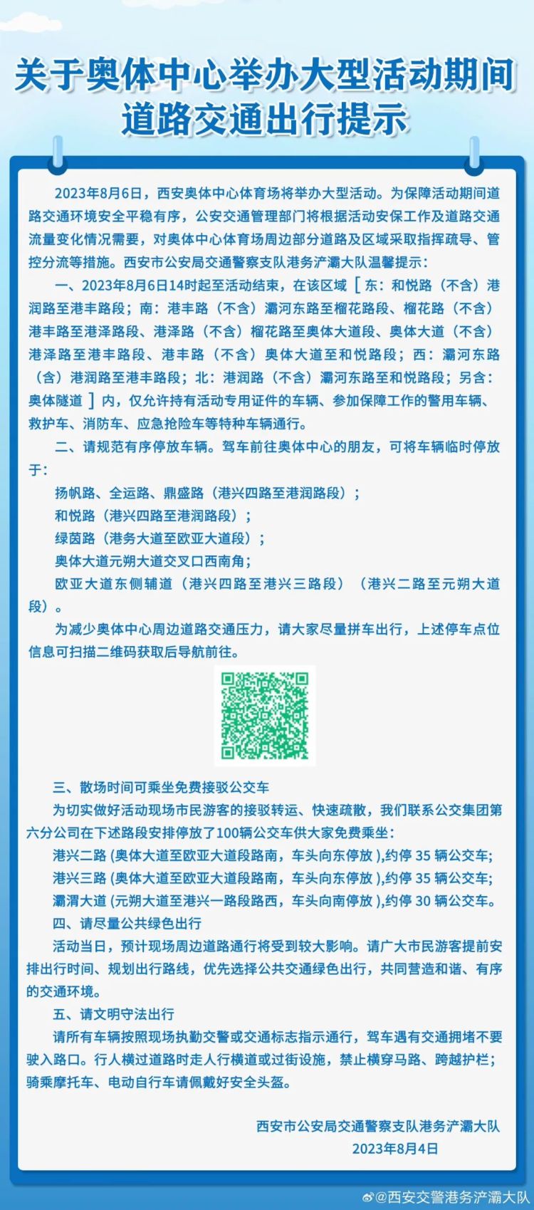 8月4日,西安交警发布《关于奥体中心举办大型活动期间道路交通出行提示》↓↓