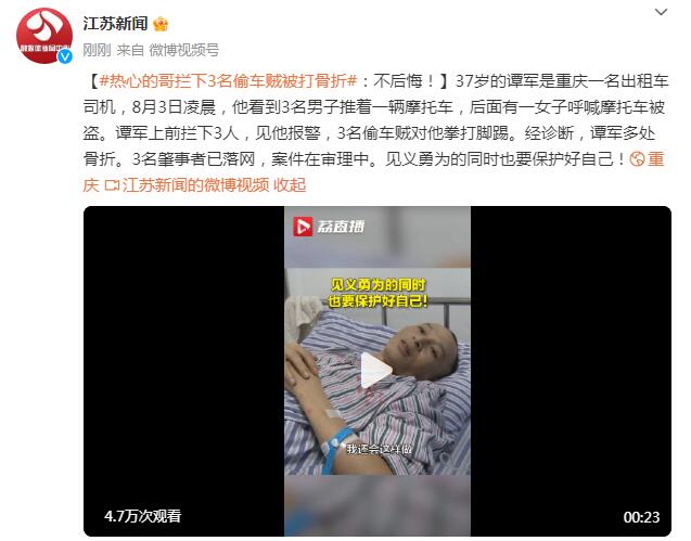37岁的谭军是重庆一名出租车司机,8月3日凌晨,他看到3名男子推着一辆摩托车,后面有一女子呼喊摩托车被盗。谭军上前拦下3人,见他报警,3名偷车贼对他拳打脚踢。经诊断,谭军多处骨折。3名肇事者已落网,案件正在审理中。见义勇为的同时也要保护好自己!